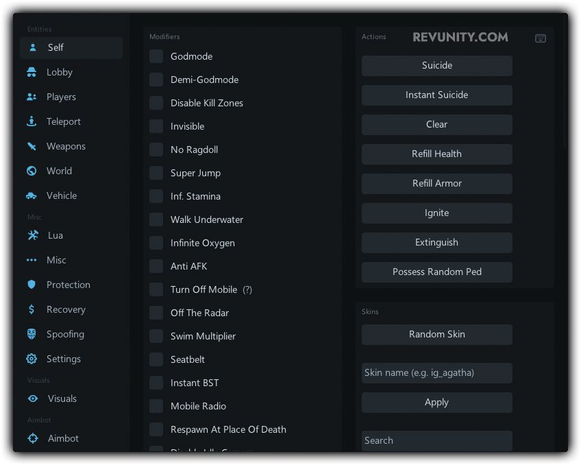 Midnight is a mod menu for the game Grand Theft Auto V. It features a user-friendly, clickable UI that allows players to easily access and activate various tools and modifications. The developers of Midnight have also created software for other popular games such as Counter-Strike: Global Offensive and Apex Legends.